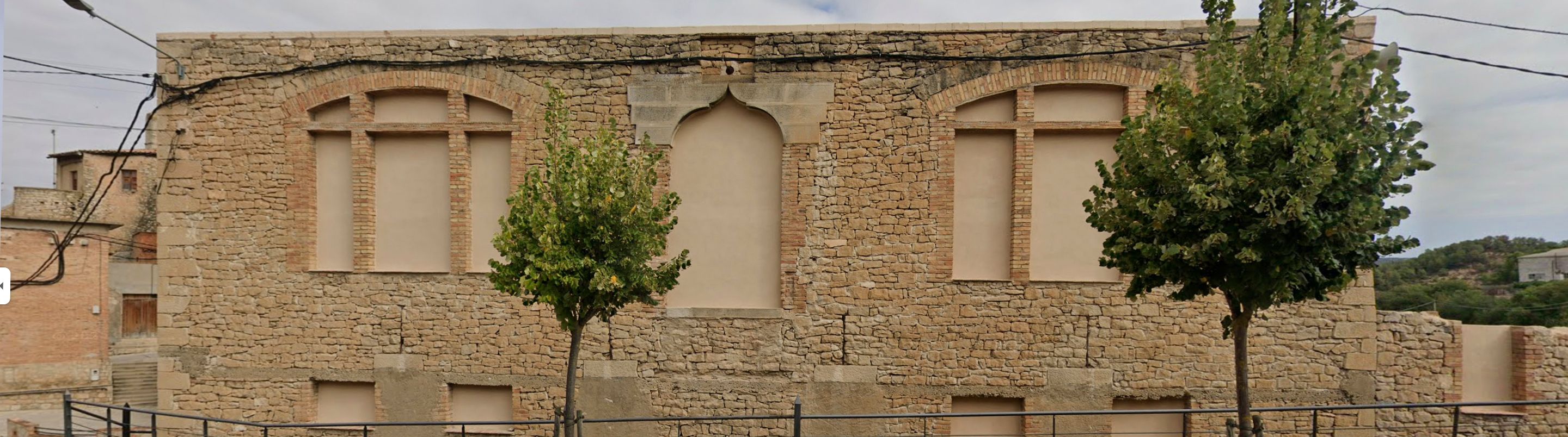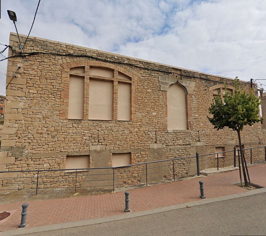 La façana principal, orientada a la carretera de Tarragona, destaca per l’arc conopial d’accés i els grans finestrals laterals. La façana est conserva una gran arcada de maó i pedra que donava entrada a la sala, reforçant el caràcter monumental de l’edifici.